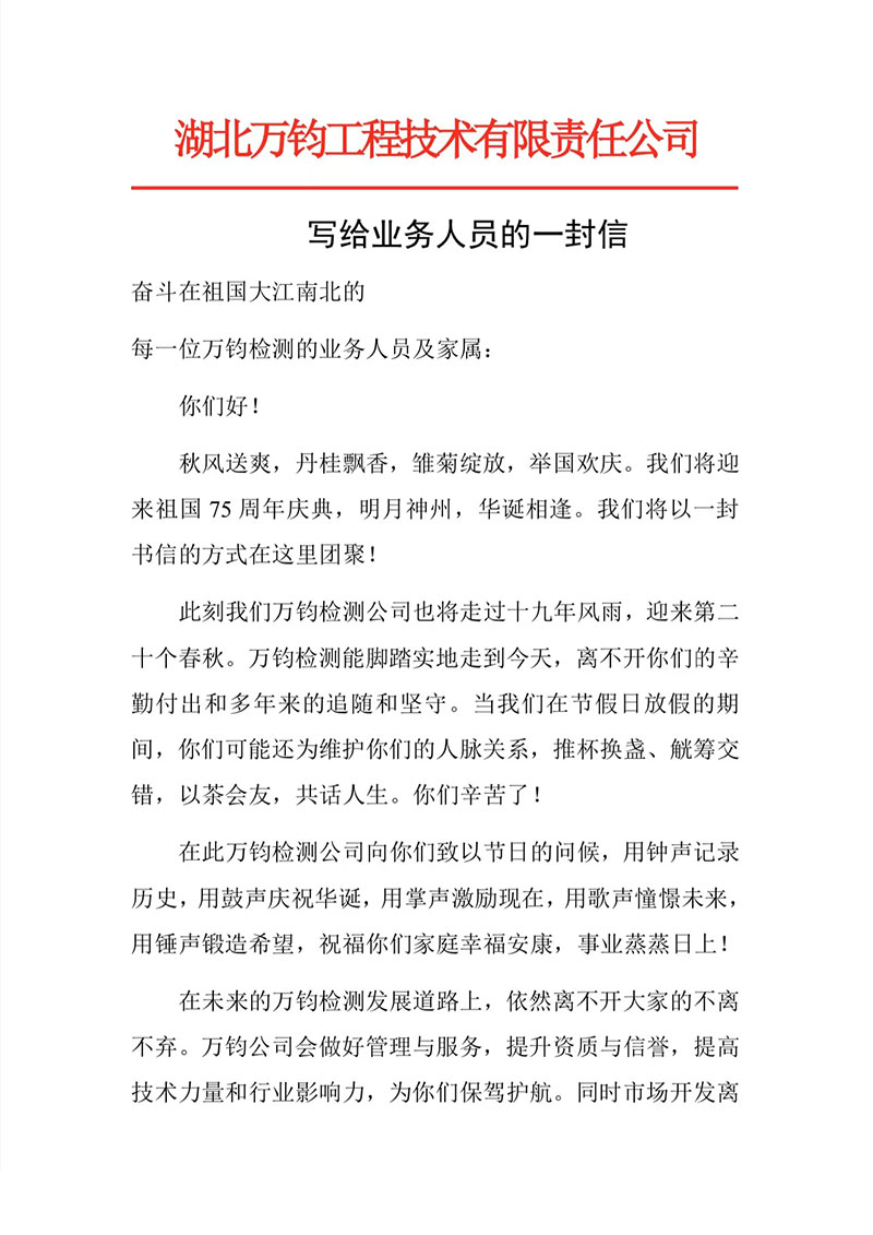 在此万钧检测公司向你们致以节日的问候,用钟声记录历史,用鼓声庆祝华诞,用掌声激励现在,用歌声憧憬未来用锤声锻造希望,祝福你们家庭幸福安康,事业蒸日上!在未来的万钧检测发展道路上,依然离不开大家的不离不弃。万钧公司会做好管理与服务,提升资质与信誉,提高技术力量和行业影响力,为你们保驾护航。同时市场开发离不开团队的力量,作为你们的平台,我们将以你们为中心,凝心聚力,诚信务实。万钧就是你们的家,你们的坚强后盾!欢迎大家常回家看看,交流业务拓展经验,未来的计划想法,给公司提建议,提要求,多提宝贵意见。另外,我公司将在元旦来临前,组织全体员工“掼蛋”比赛,请大家业余时间操练武艺,准备迎战。届时会发报名邀请函,欢迎大家踊跃报名,积极参加,一举“中标”!