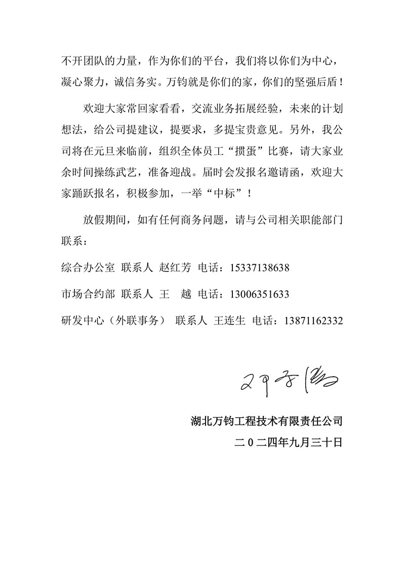在此万钧检测公司向你们致以节日的问候,用钟声记录历史,用鼓声庆祝华诞,用掌声激励现在,用歌声憧憬未来用锤声锻造希望,祝福你们家庭幸福安康,事业蒸日上!在未来的万钧检测发展道路上,依然离不开大家的不离不弃。万钧公司会做好管理与服务,提升资质与信誉,提高技术力量和行业影响力,为你们保驾护航。同时市场开发离不开团队的力量,作为你们的平台,我们将以你们为中心,凝心聚力,诚信务实。万钧就是你们的家,你们的坚强后盾!欢迎大家常回家看看,交流业务拓展经验,未来的计划想法,给公司提建议,提要求,多提宝贵意见。另外,我公司将在元旦来临前,组织全体员工“掼蛋”比赛,请大家业余时间操练武艺,准备迎战。届时会发报名邀请函,欢迎大家踊跃报名,积极参加,一举“中标”!